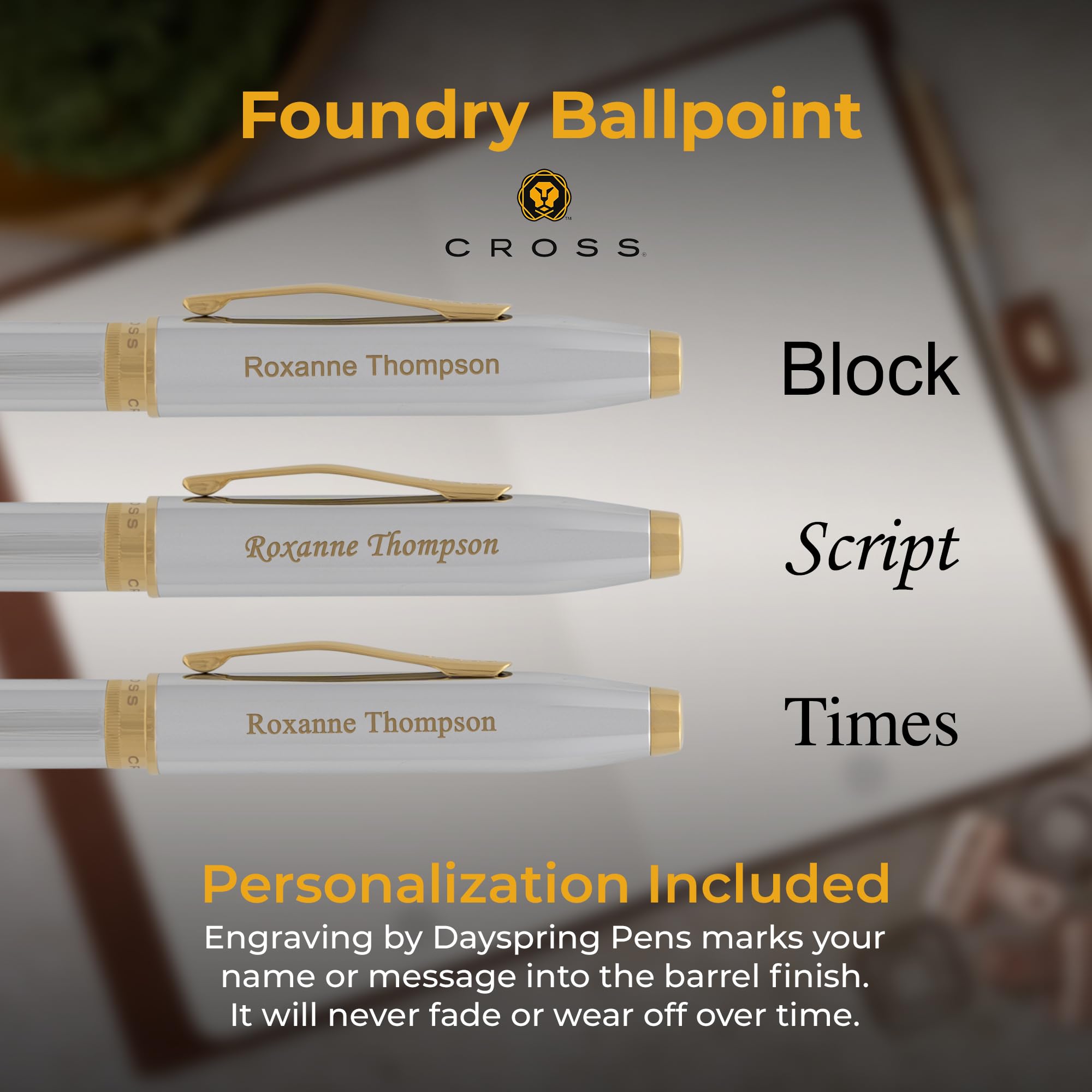 - Engraving included on barrel: Up to 30 characters laser-engraved in tone-on-tone brass on the polished chrome barrel — a name, title, initials, date, or short message. The engraving is permanently set into the chrome finish