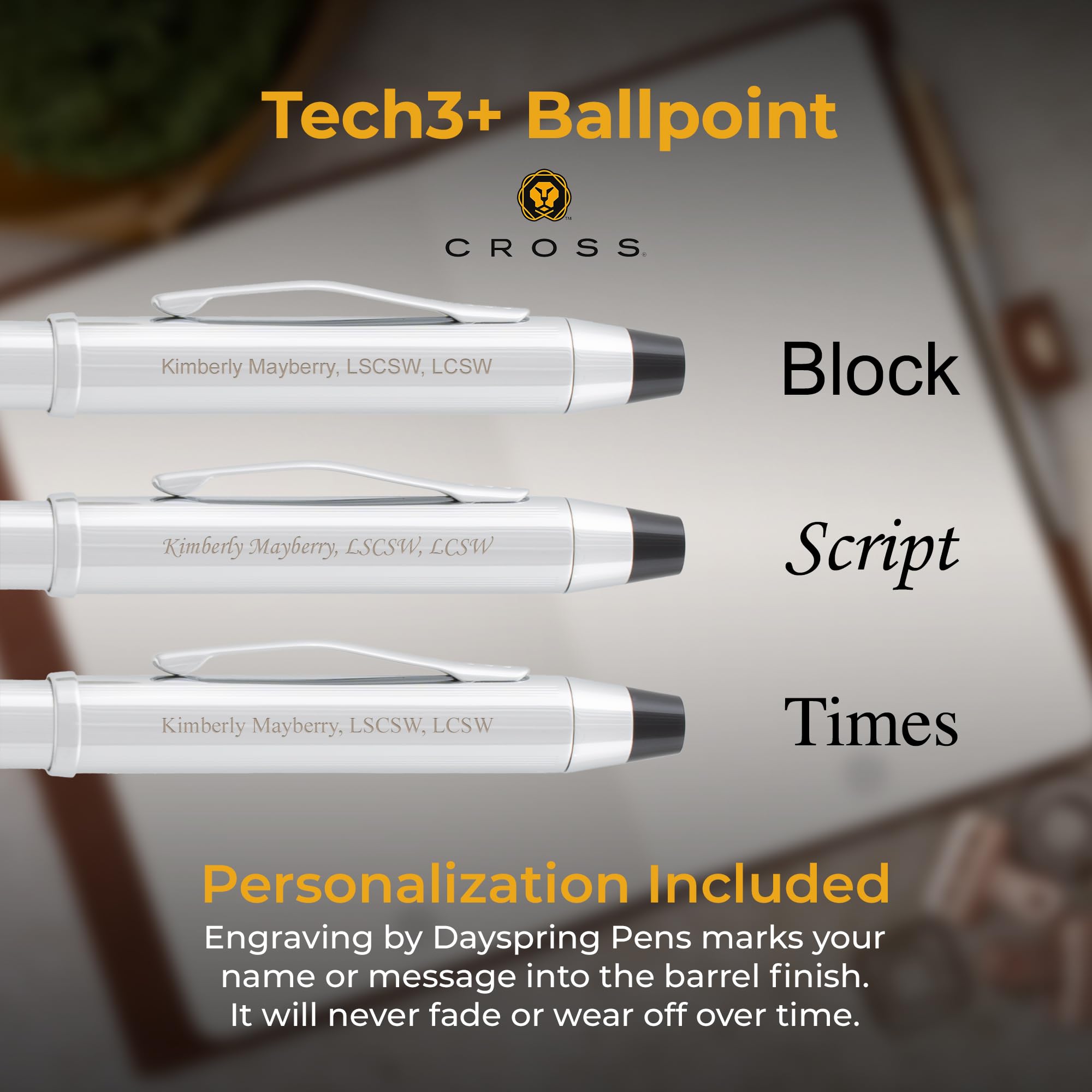 - Laser-engraved personalization: Add a name, initials, date, or short message — up to 30 characters engraved in brass below the clip on the chrome barrel. Engraving is permanent and will not fade, peel, or wear off with daily use