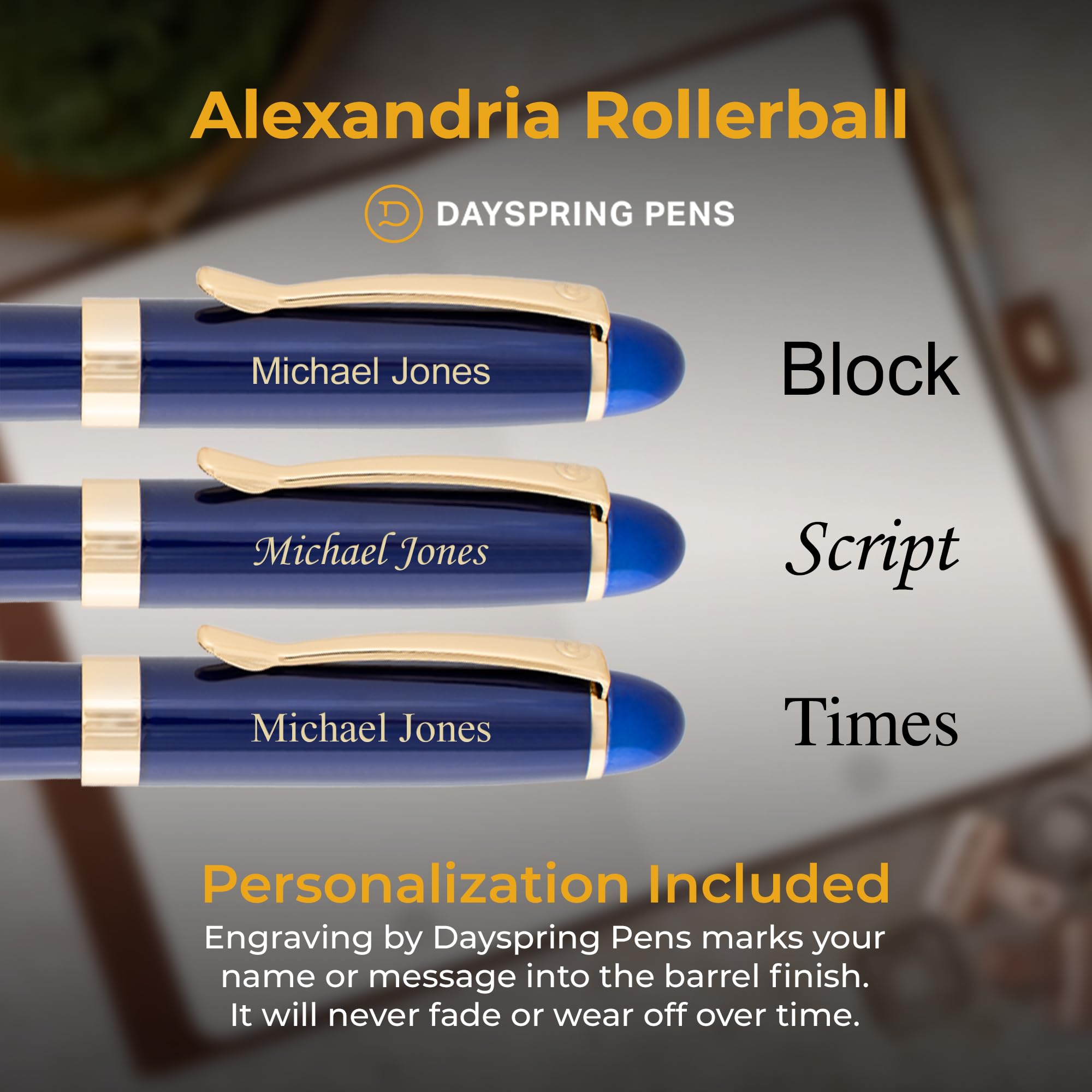 - Gift-ready packaging: Arrives in a Dayspring Pens gift box for direct gifting. The Alexandria is an accessible engraved rollerball for a new graduate, new hire, teacher, nurse, or administrative professional gift