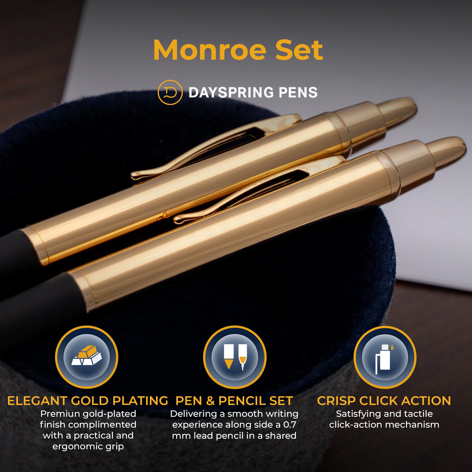 Dayspring Pens Gold Pen Set | Monroe Ballpoint and 0.7mm Pencil Set in 18 Karat Gold Plated Finish. Experience Affordable Luxury.