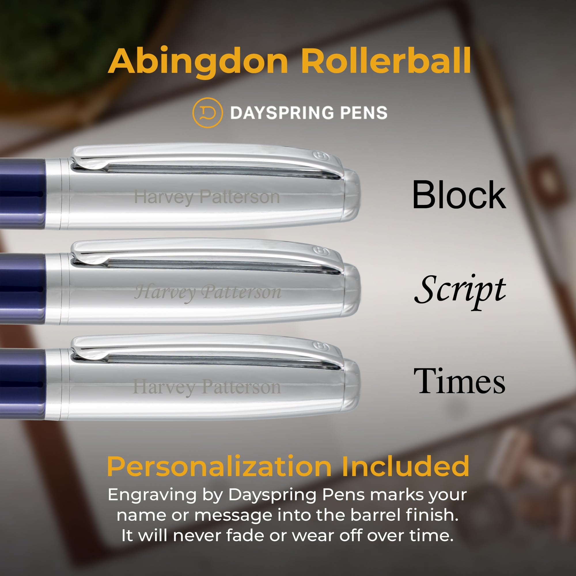- Personalized Engraving: Elevate your Abingdon Rollerball Pen with up to 30 characters of custom engraving. Whether it's a name or a message, your words will be elegantly etched in a subtle tone-on-tone, light brass color.