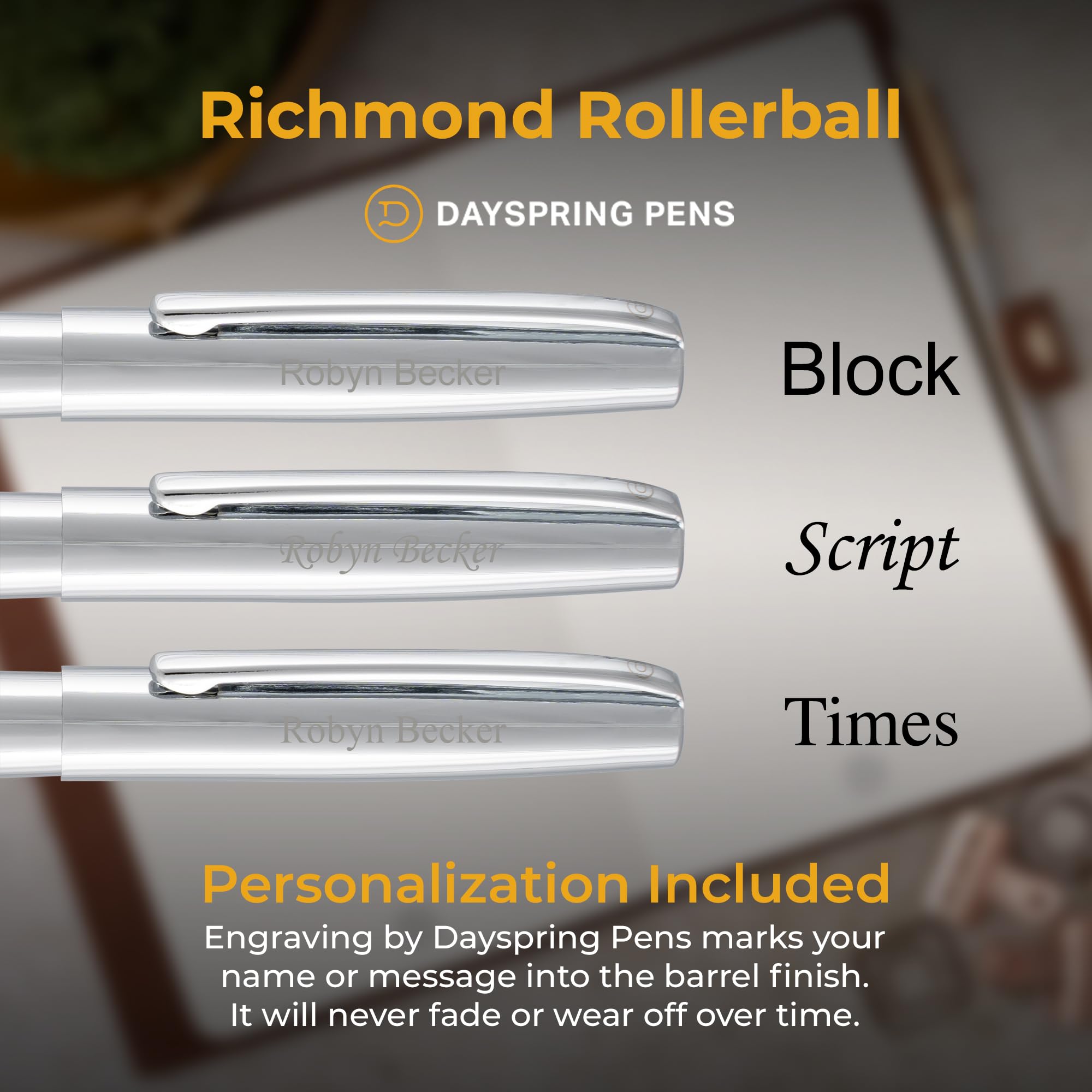 - Gift-ready packaging: Arrives in a Dayspring Pens gift box for direct gifting. The Richmond is an accessible engraved rollerball for a new graduate, new hire, teacher, nurse, or administrative professional gift