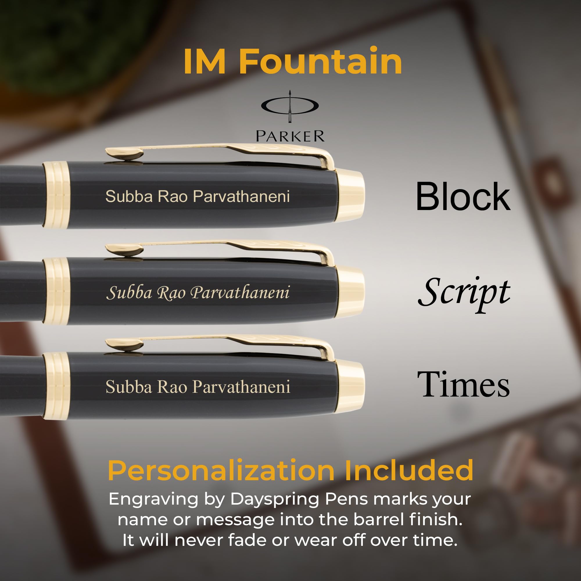 Parker IM Engraved Fountain Pen, Black Lacquer with Gold Trim, Stainless Steel Medium Nib, Personalized Gift for Graduation, Retirement, Career Advancement, Bar Passage, Parker Gift Box Included